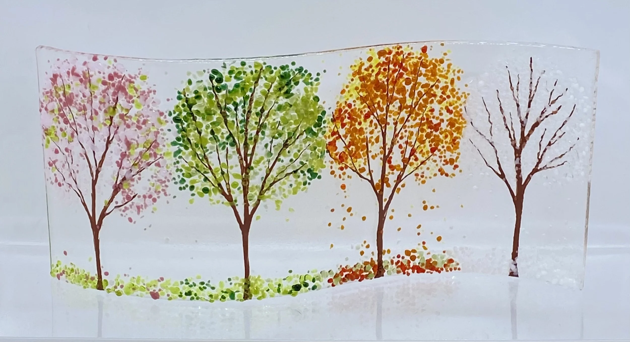 This is another really popular workshop where you design and create a freestanding S-bend with 4 trees representing the 4 seasons. There will be a range of glass frit (crushed glass) and glass paints, to help you decorate your S- Bend. Despite the brief it always amazes me how different each one looks.