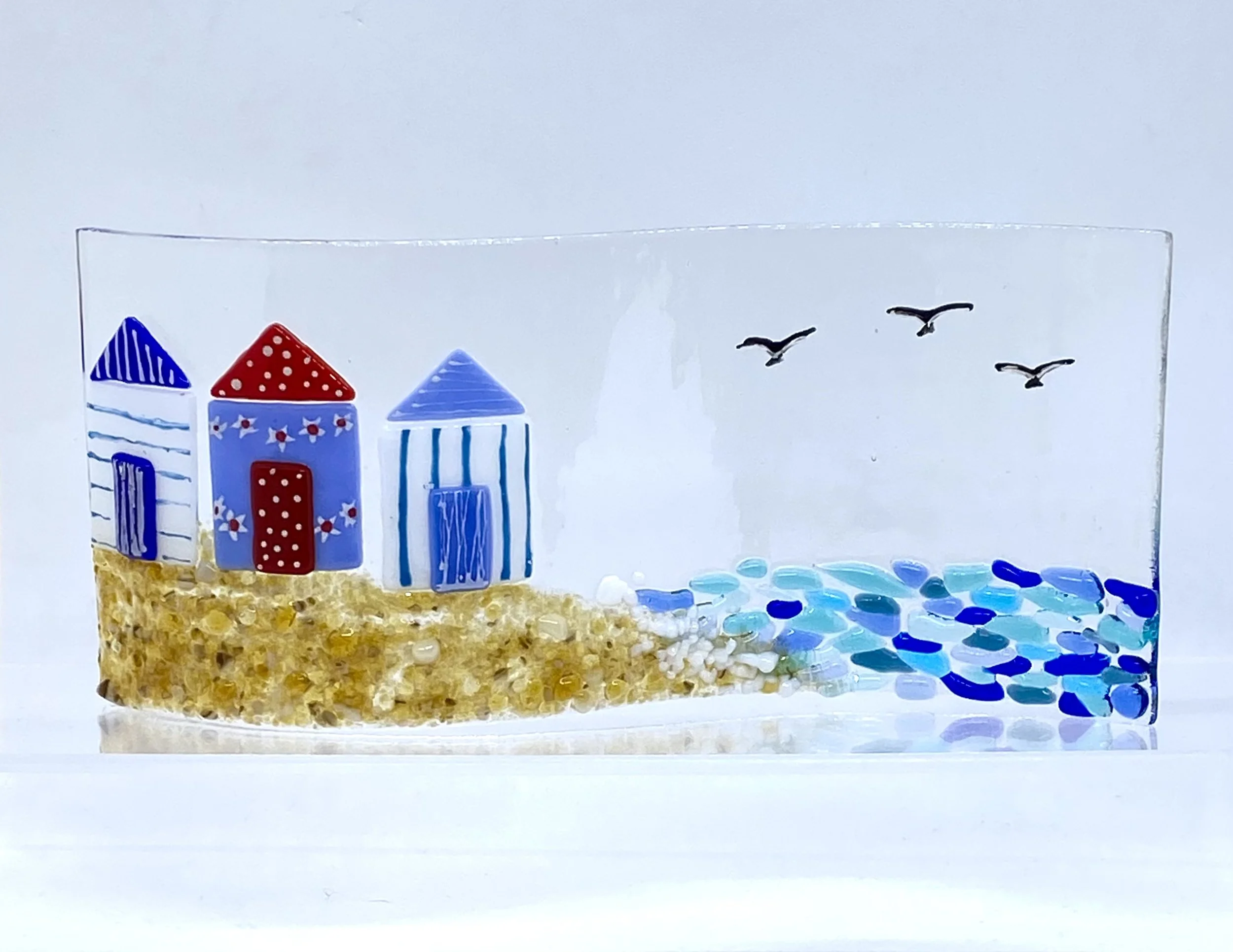 This is a really popular workshop where you design and create a freestanding S-bend that features a beach scene. There will be a range of glass in gorgeous sea and sand colours, as well as some pre-cut beach huts to decorate, to help you create a piece of art unique to you.